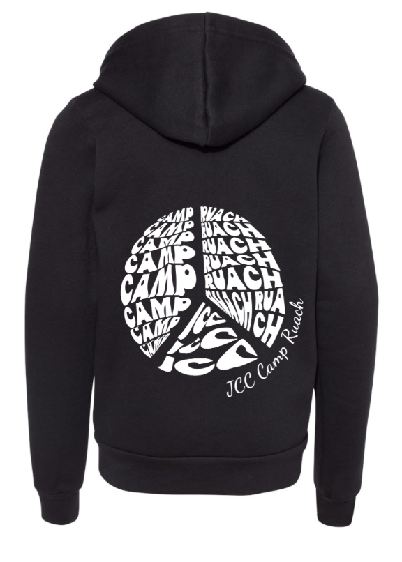 Bella and Canvas zip up sweatshirt with JCC Camp Ruach peace sign on the back.