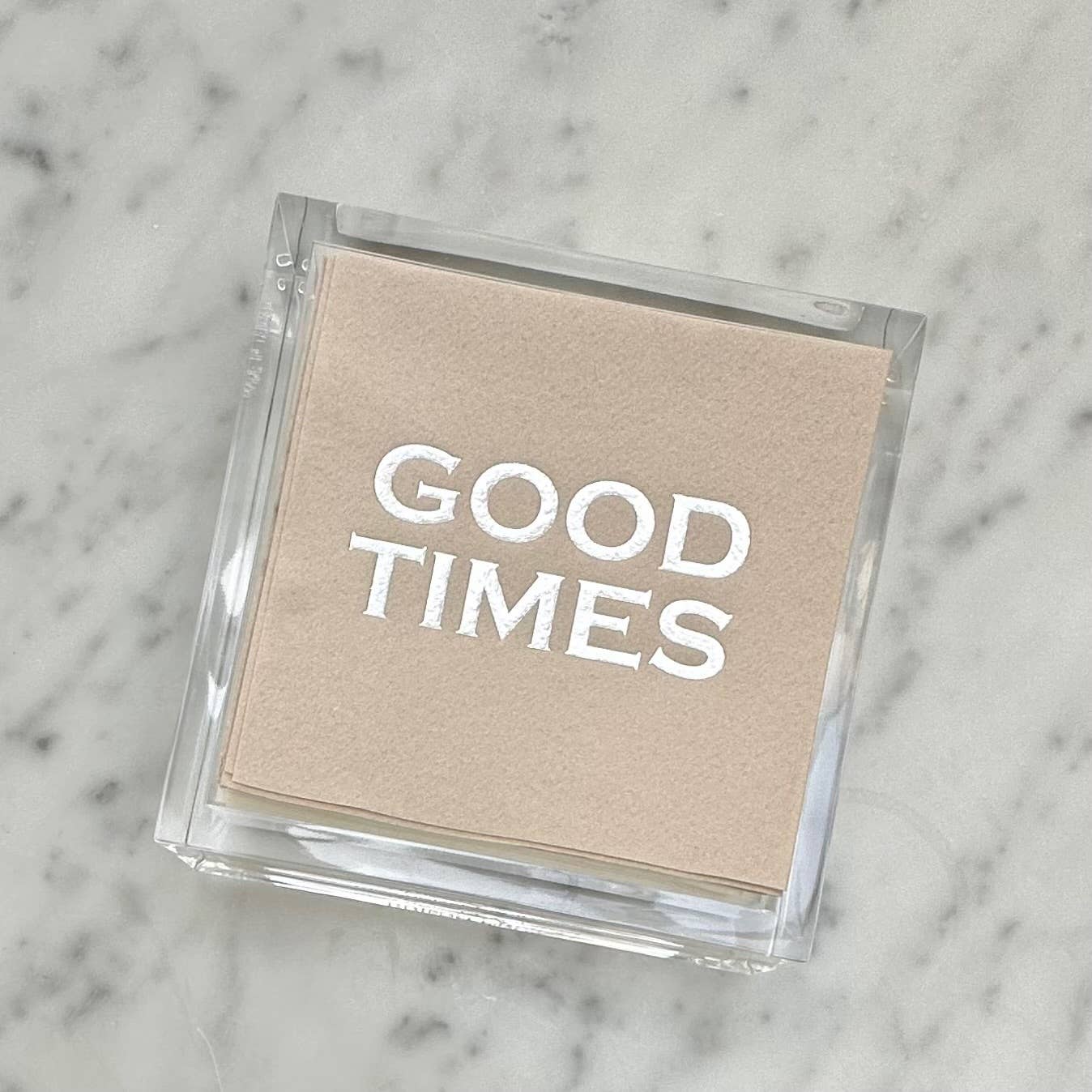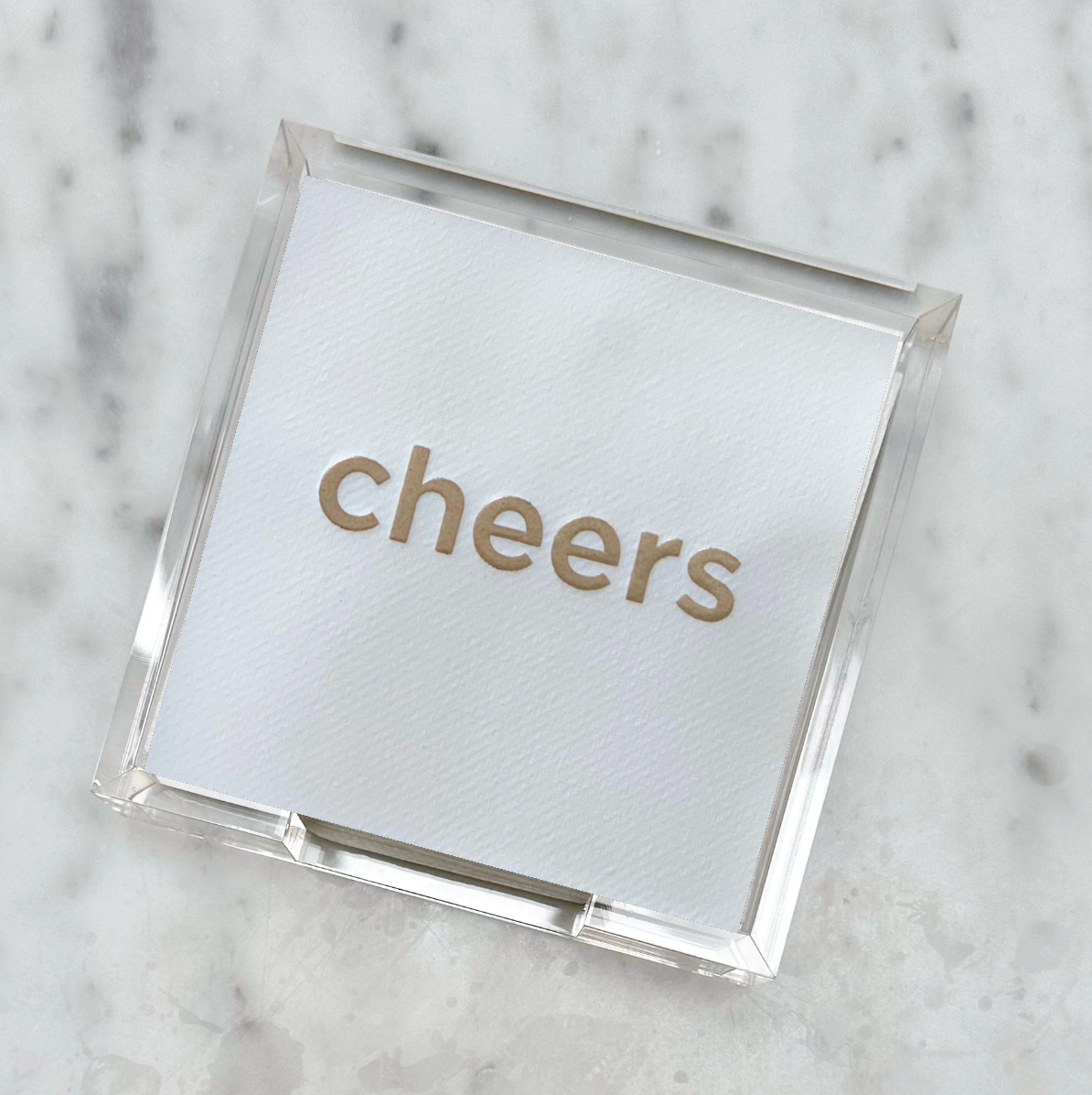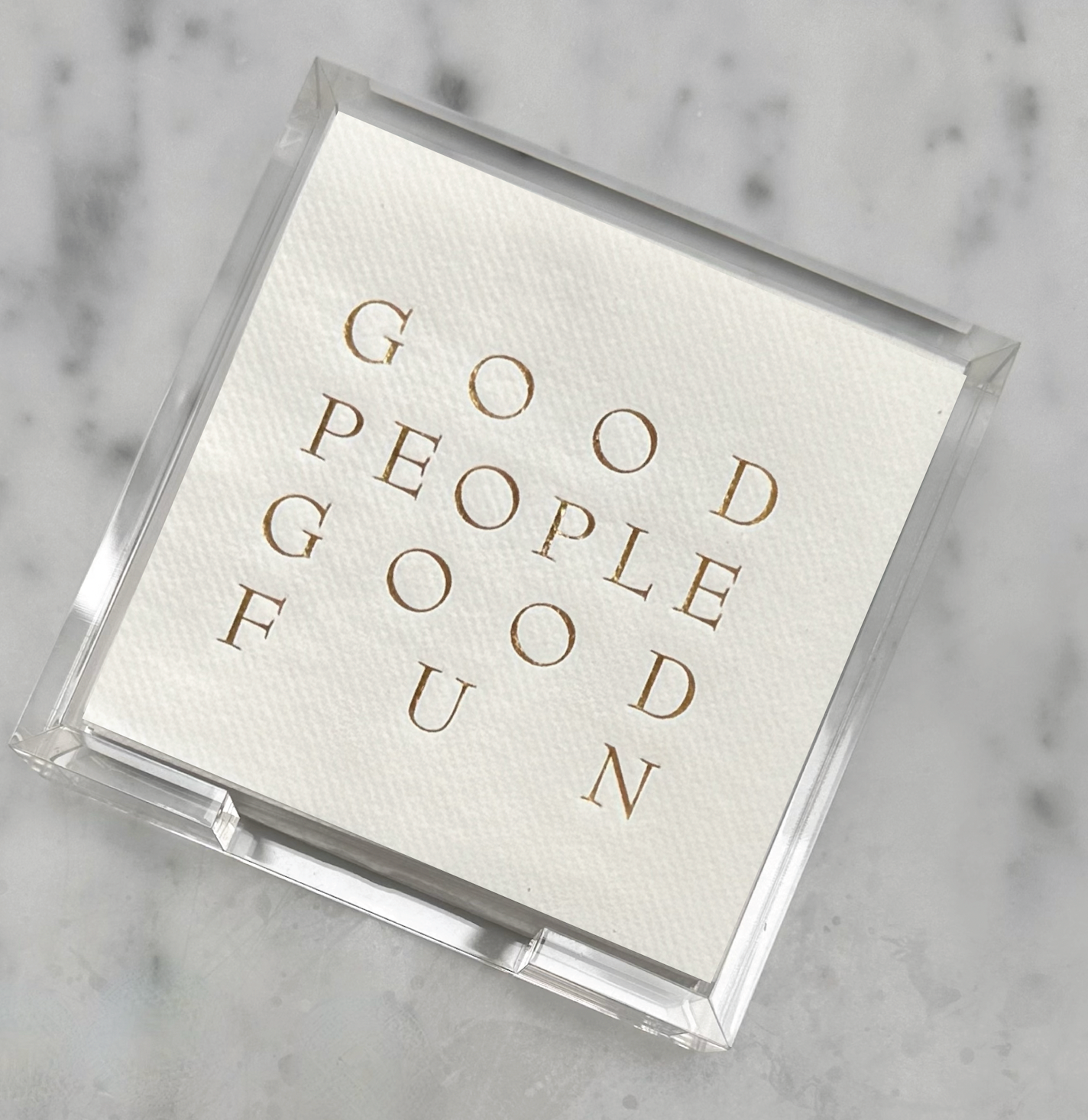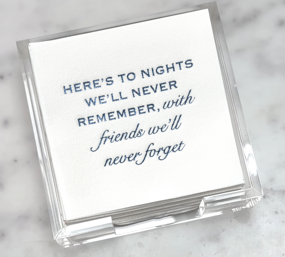 Our heavy-weight acrylic trays are both beautiful and functional. They have a unique cut-out on one side to add function to form. The crystal clear, 8mm thick acrylic has a nice heft and a clean look. Each tray contains 24 cloth-like disposable napkins with a foil embossed message that has a rich, letter-press effect that is several cuts above your average paper cocktail napkin. Elevate your hosting or bring this to your favorite hostess to add some chic style and fun.