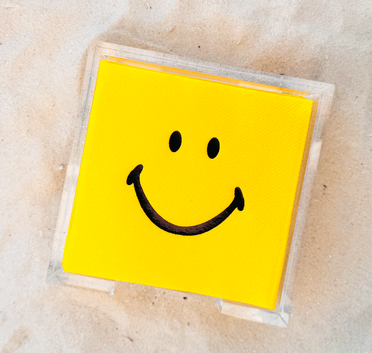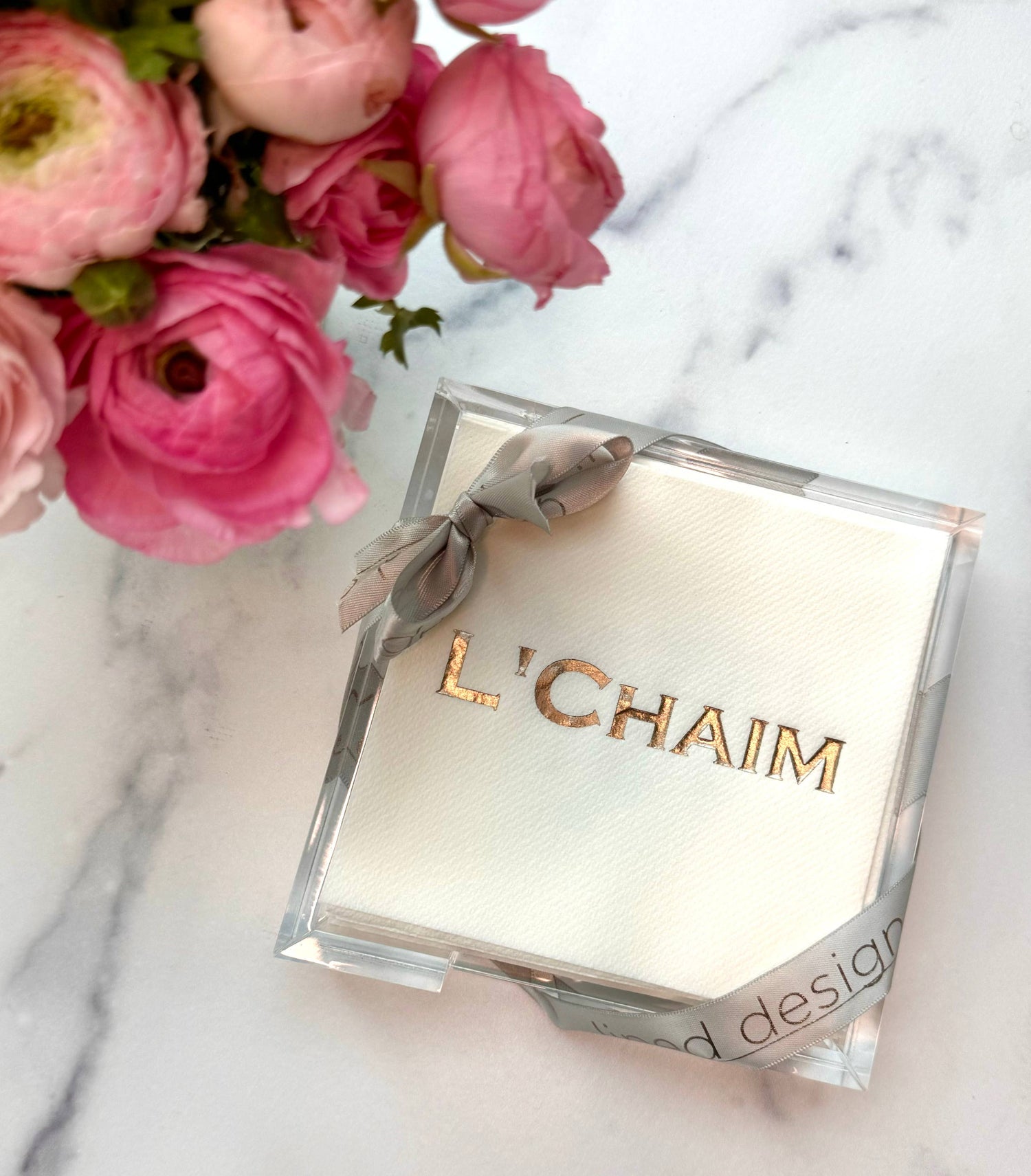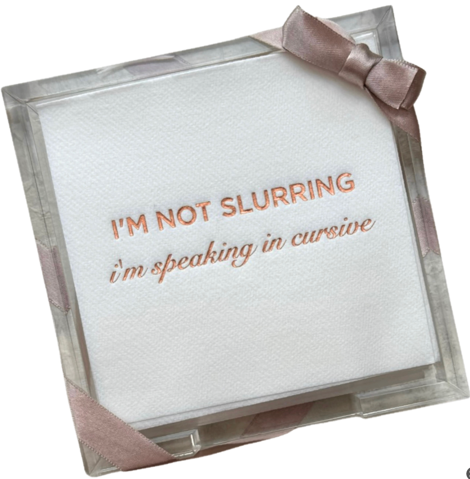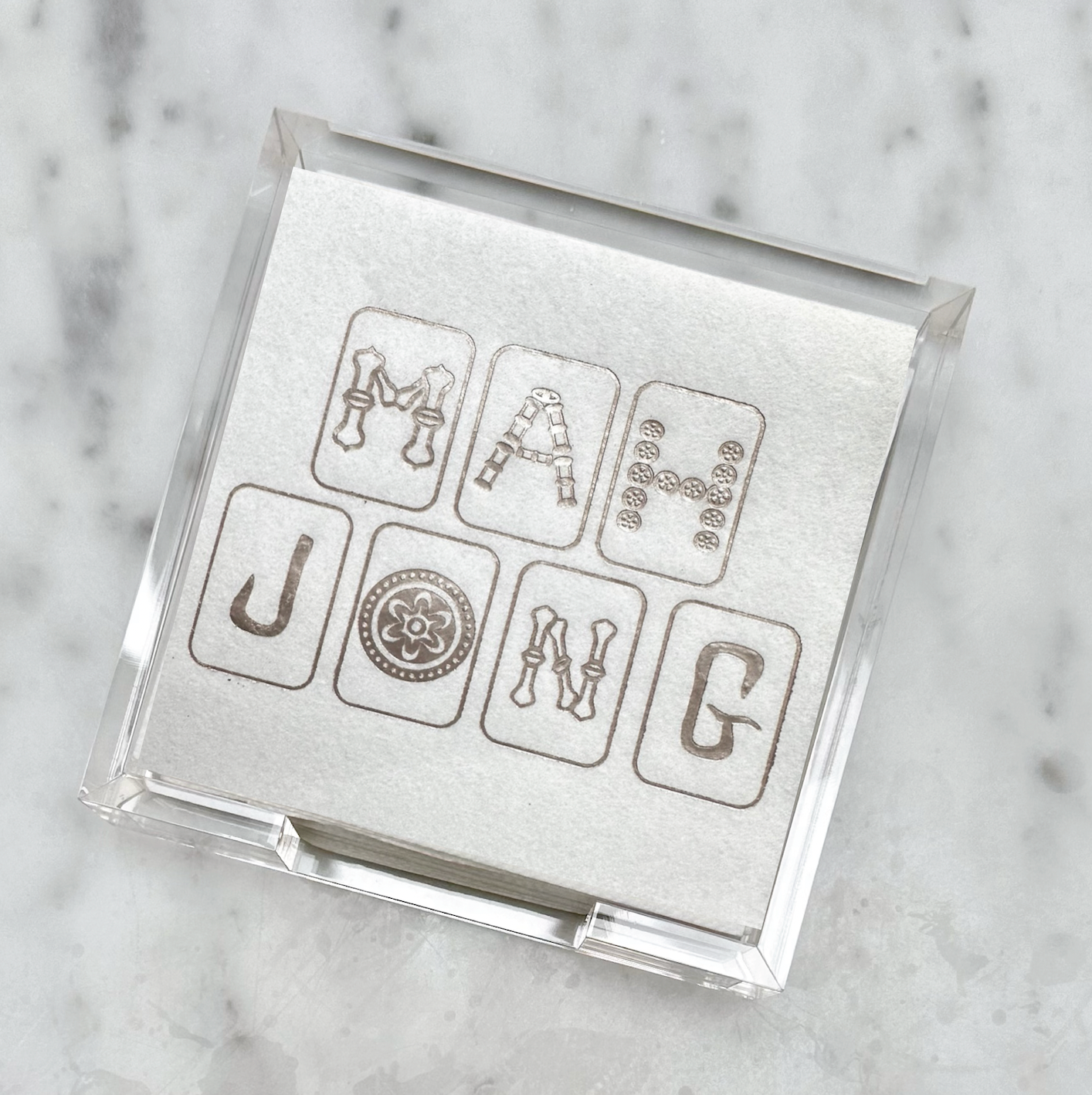 Our heavy-weight acrylic trays are both beautiful and functional. They have a unique cut-out on one side to add function to form. The crystal clear, 8mm thick acrylic has a nice heft and a clean look. Each tray contains 24 cloth-like disposable napkins with a foil embossed message that has a rich, letter-press effect that is several cuts above your average paper cocktail napkin. Elevate your hosting or bring this to your favorite hostess to add some chic style and fun.