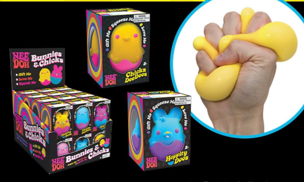 The cutest combo of happy hoppy bunnies and sunshine squishy chicks. includes a removable eggshell display stand. Dough-filled sensory satisfaction. Three assorted color animals- (pink blue yellow). 3.25 inches tall. Three assorted egg shells (purple, blue, pink).