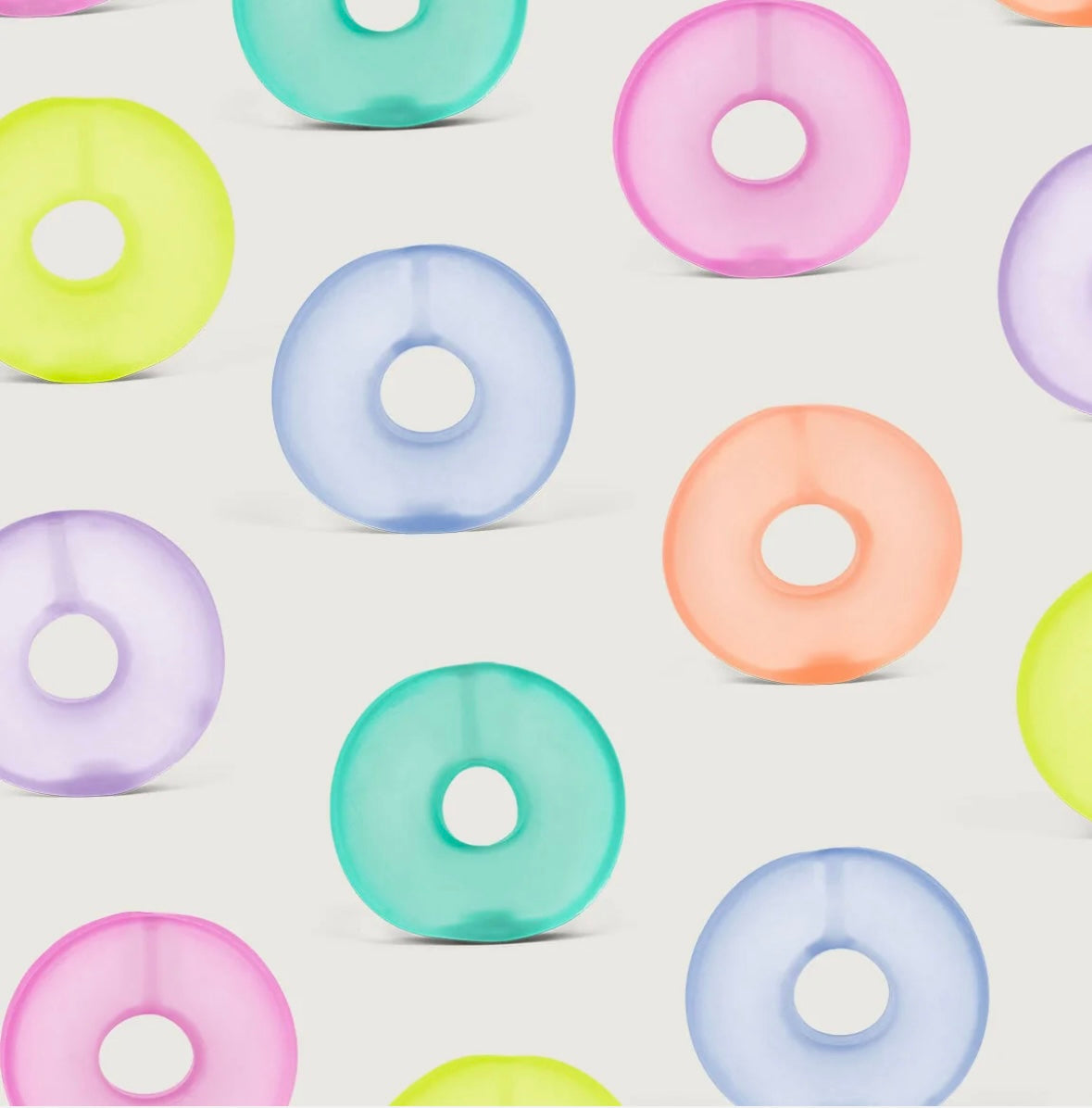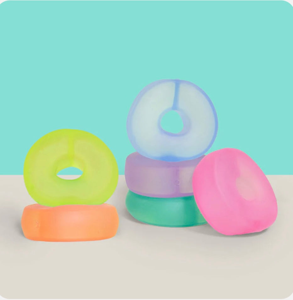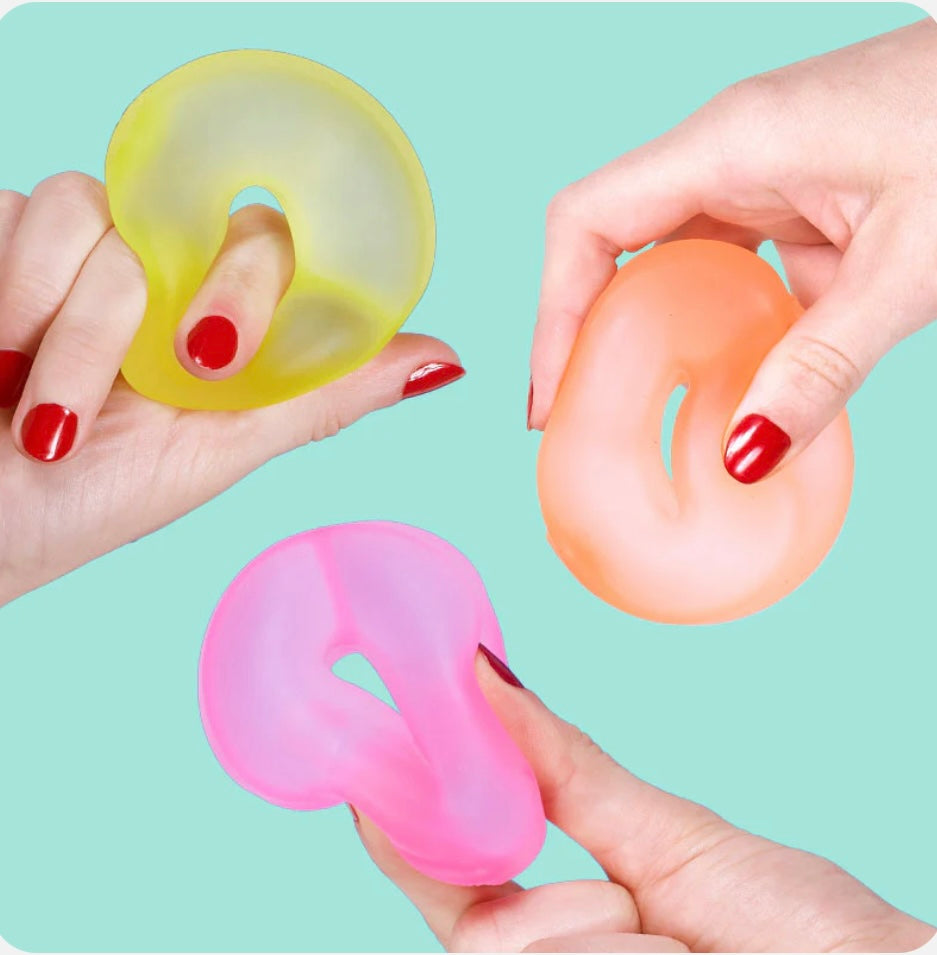 Soft and squishy stress loops with a memory gel filling in a rainbow of colors.