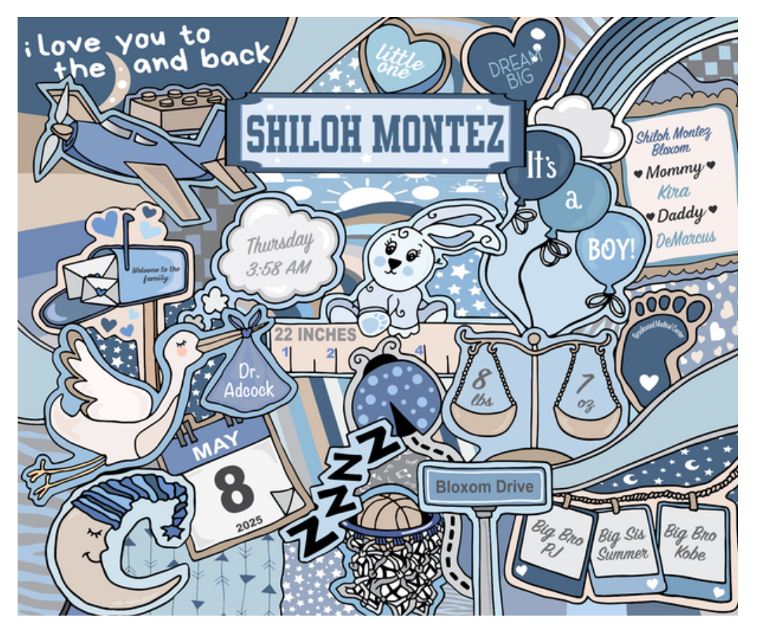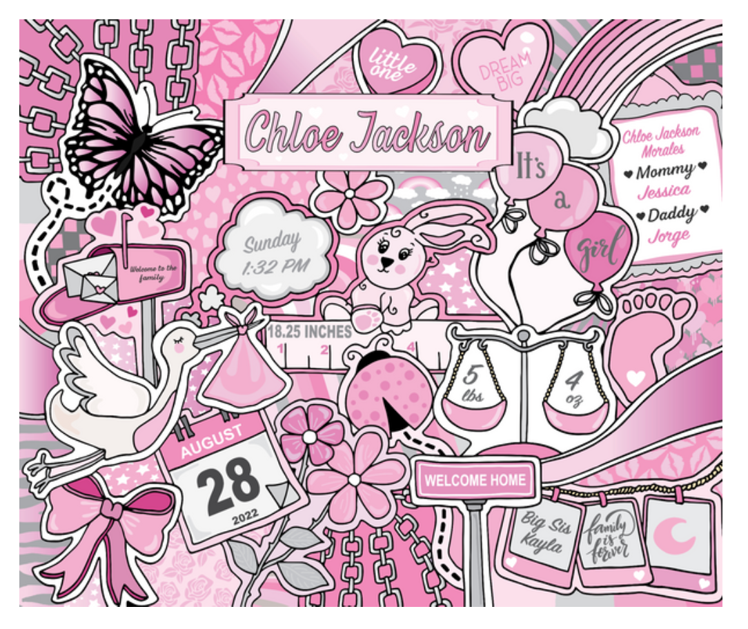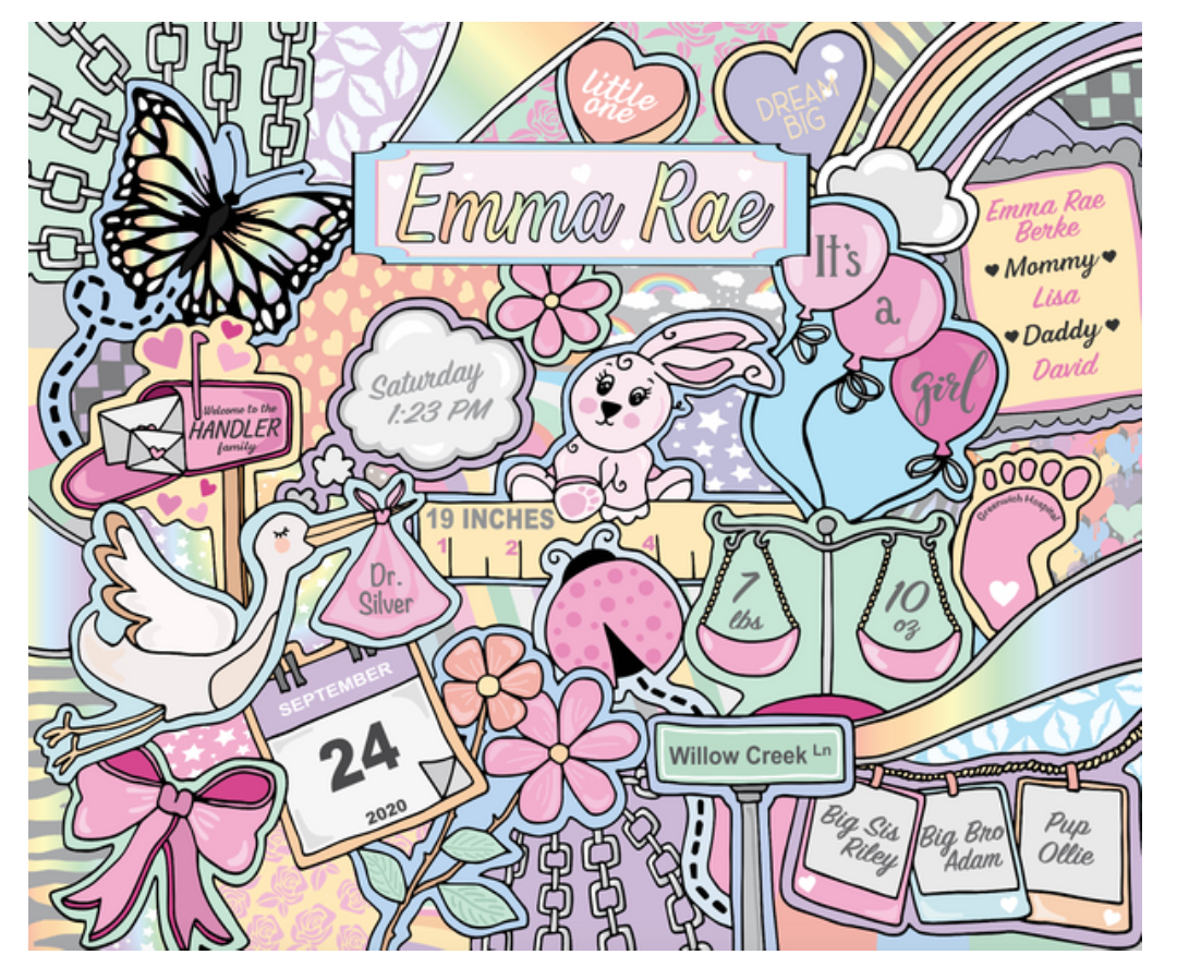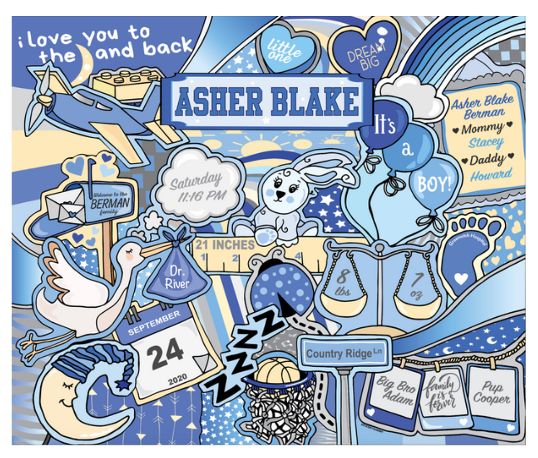 1.Baby full name 2. Date of birth 3. Time of birth (am/pm) 4. Length 5. Weight 6. Home address 7. Mom AND dad name 8. Sibling name (girl/boy) (opt) 9. Pet name/type (opt) 10. Hospital (opt) 11 . Birth doctor (opt)