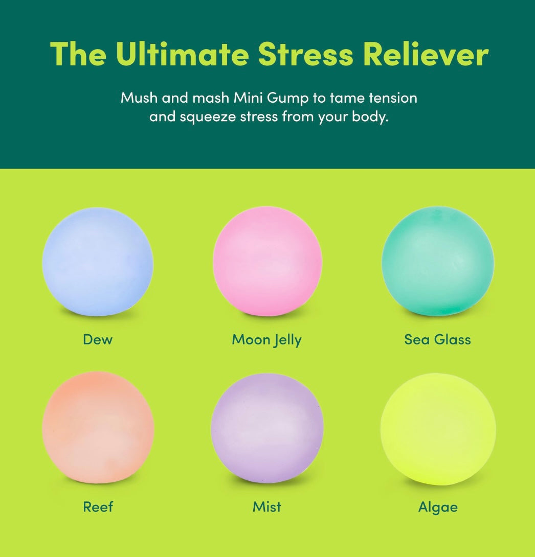 Love slime but hate the mess? Gump is for you! Filled with a pliable gel, Gump is the stress ball that always bounces back, keeping your mind clear and your hands clean. Available in 3 sizes and 7 translucent colors you can choose your favorite or collect them all. There's a Gump for every palm!