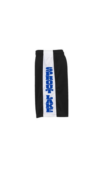 Black basketball shorts with Sprout Lake is in metallic blue