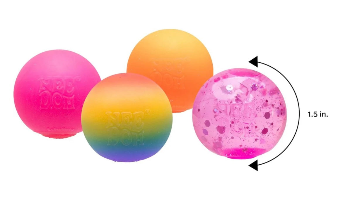 his four-pack of NeeDoh sensory balls brings endless squishable entertainment to playtime. Each uniquely designed ball invites hands-on exploration—perfect for fidgeting, tossing, and imaginative sports-themed adventures. Whether your child needs a calming fidget during quiet moments or an active companion for outdoor fun, this collection delivers satisfying tactile feedback and hours of engagement. Built to withstand enthusiastic play, these durable squeeze toys are a go-to choice for keeping kids happily occupied. Assorted colors included.